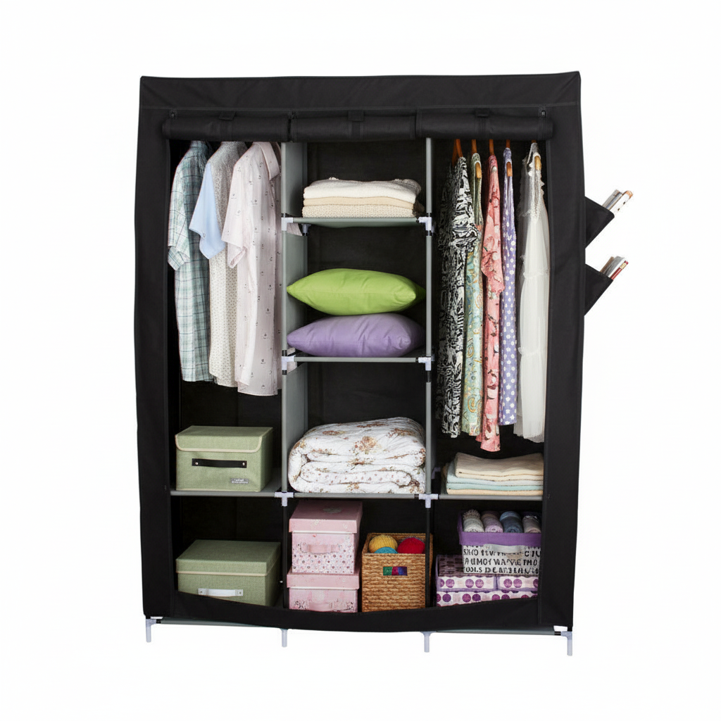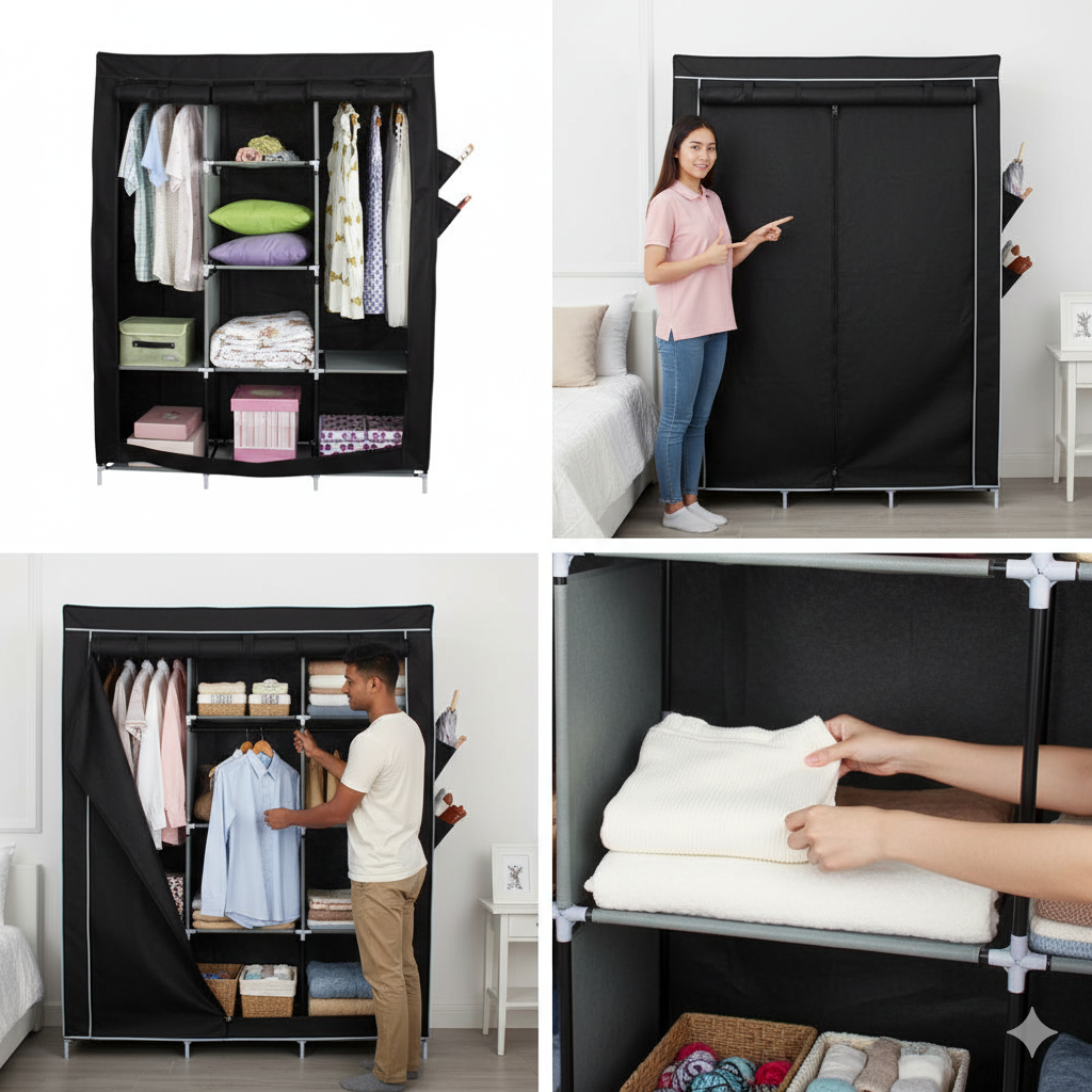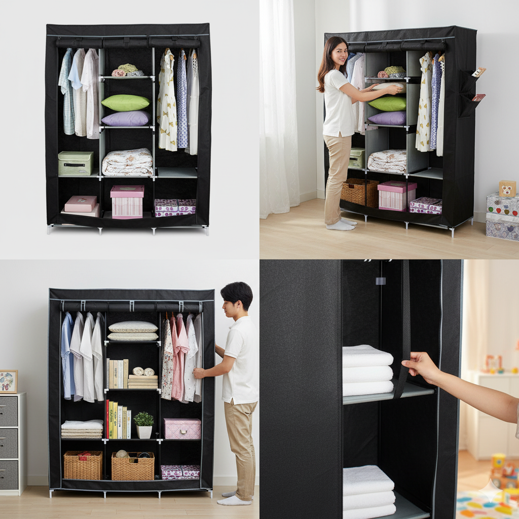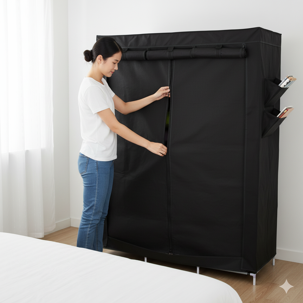 Gracias a su diseño modular y fácil montaje, podrás tenerlo listo en un abrir y cerrar de ojos, sin herramientas invasivas ni obras. La cubierta con cremallera te permite acceder a tu ropa o accesorios de forma rápida mientras mantienes todo fuera de la vista.