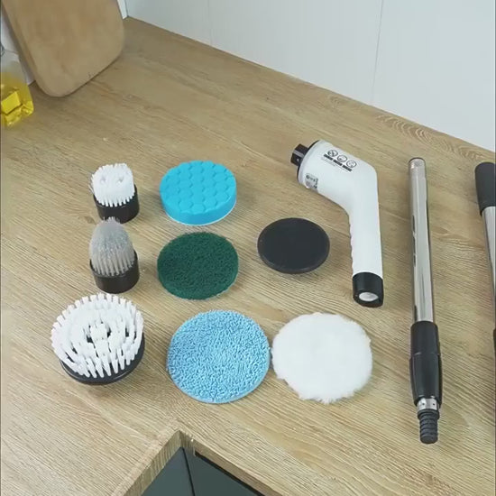 Equipado con 9 cabezales intercambiables, adaptables para bañeras, azulejos, juntas, ruedas de coche y más, se convierte en un accesorio multitarea que sustituye varios utensilios tradicionales.