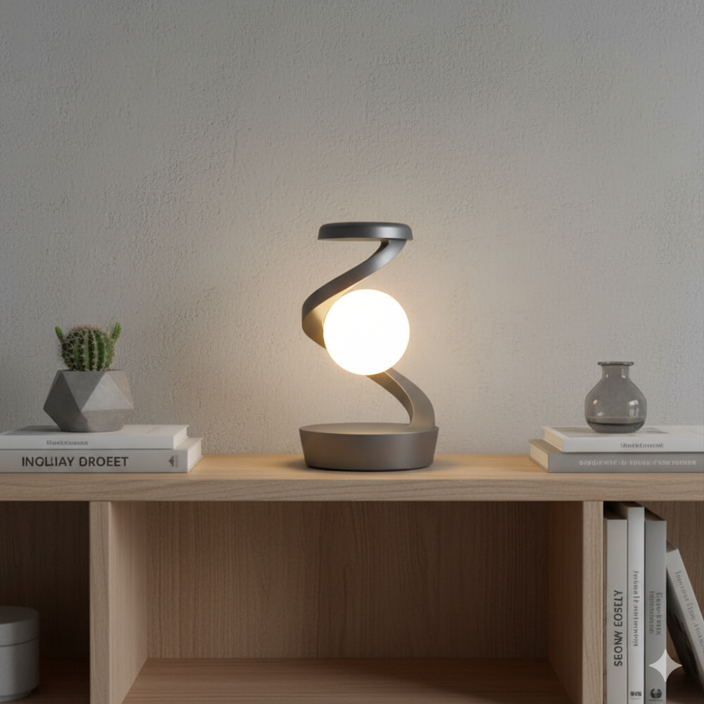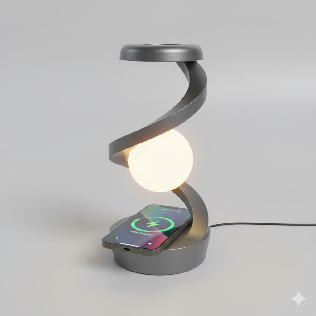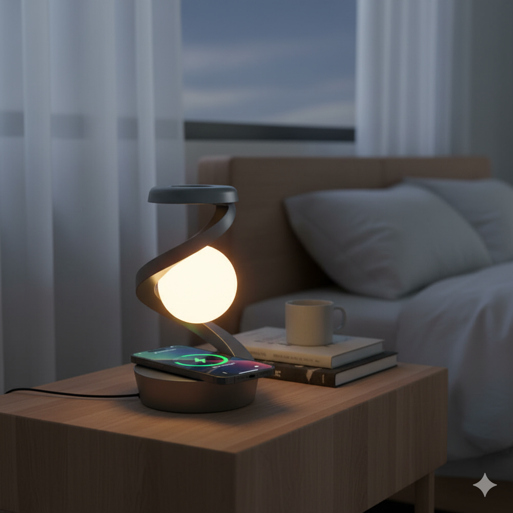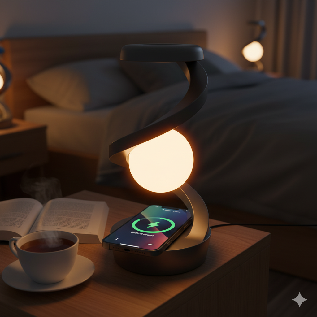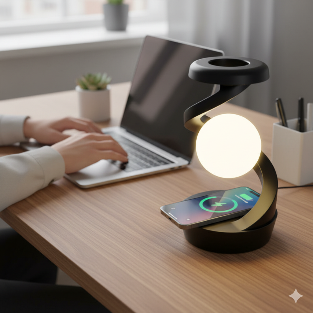 “Suspende la gravedad, ilumina tu inspiración: la luna flota sobre tu mesa y carga tu móvil sin cables.”