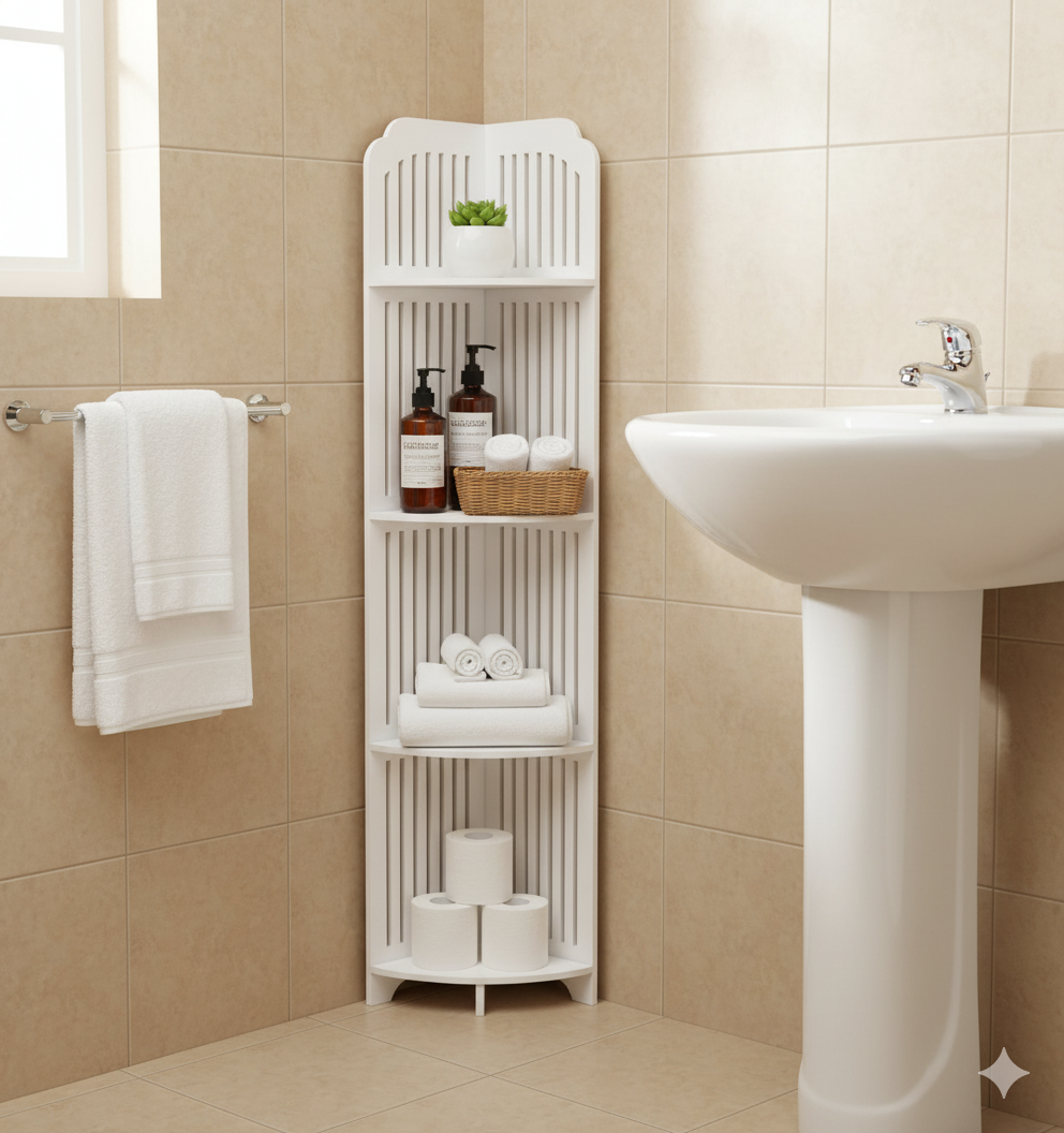 - Ahorro de espacio: Diseñada para aprovechar esquinas y mantener el baño ordenado.