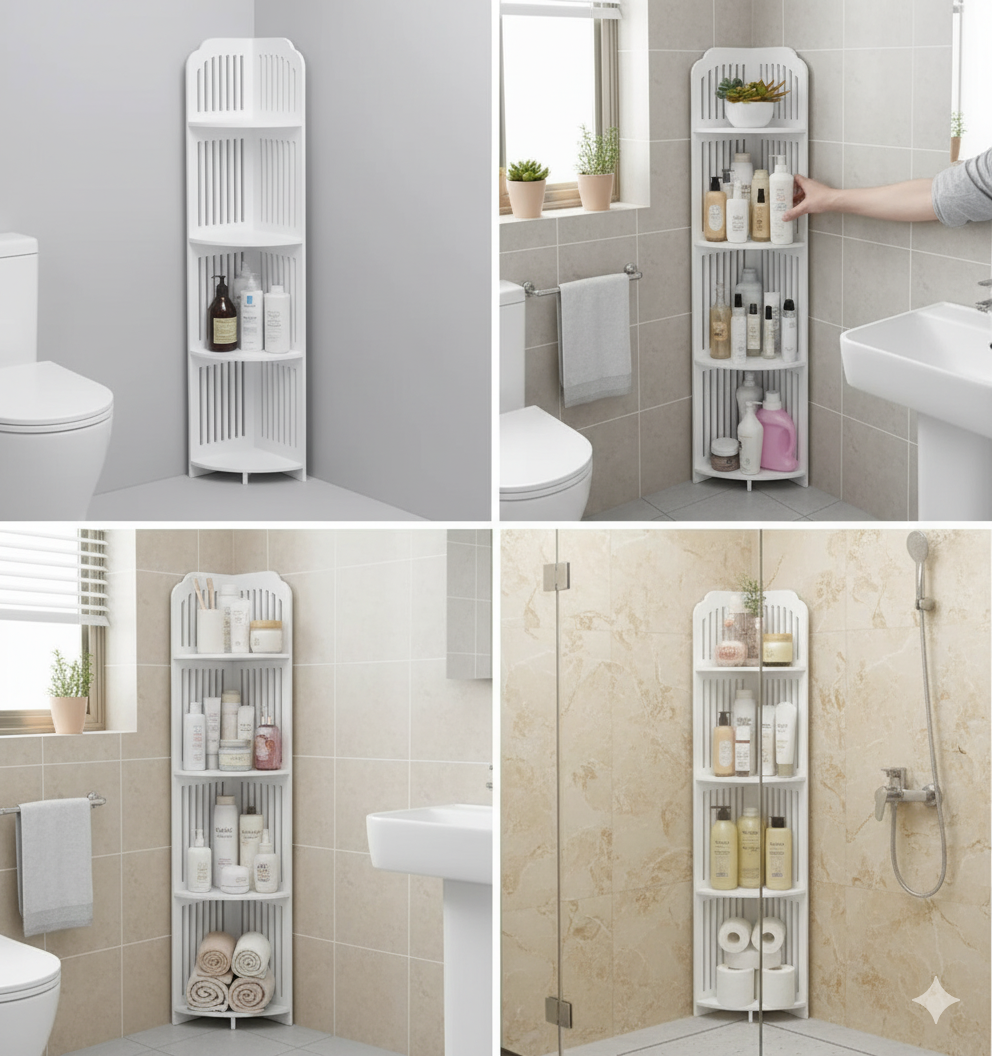 Optimiza el espacio de tu baño con esta práctica estantería triangular de pie, diseñada para encajar perfectamente en las esquinas. Ideal para mantener tus suministros de baño organizados y al alcance, su diseño elegante y resistente complementa cualquier decoración.
