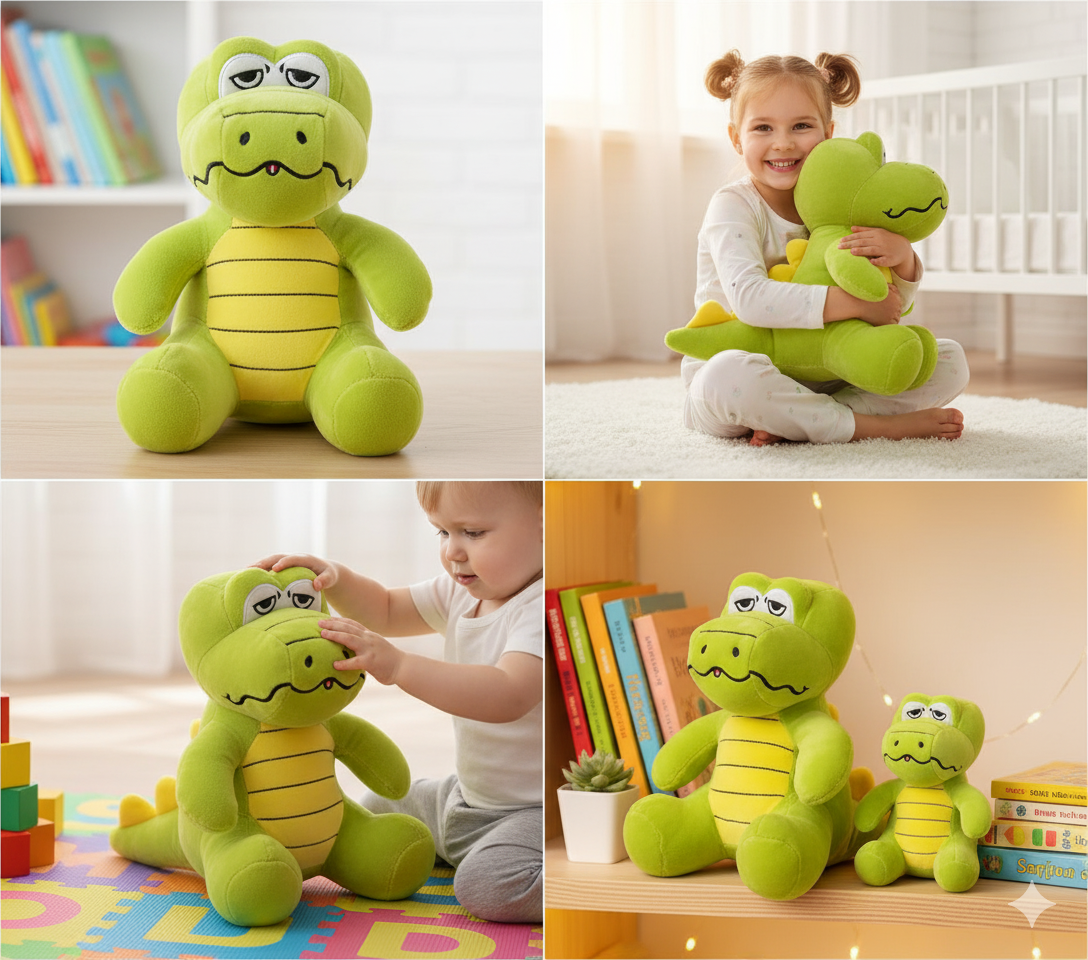 “Un abrazo de felpa que ruge ternura: el cocodrilo que conquista sonrisas desde el sofá.”